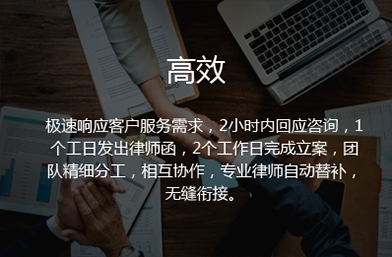 極速響應客戶服務需求,2小時內回應咨詢,1個工日發出律師函,2個工作日完成立案,團隊精細分工,相互協作,專業律師自動替補,無縫銜接。